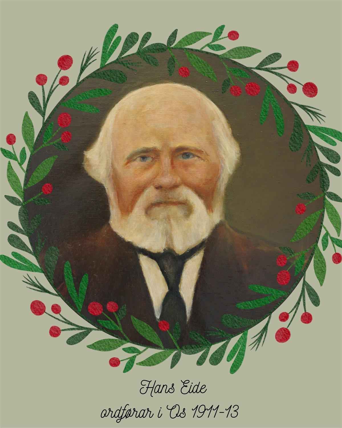 Hans Eide (1858-1945), portrettert av Sigurd BuggeI blant blir gigantiske, kvardagsomveltande kommunale saker realisert så fort at det er nesten ikkje til å tru. Høyr berre: i Os heradstyre sitt møte heilt på slutten av året 1911 blei det lufta om det ikkje var på tide å få elektrisk kraft til bygda. Før jul 1914 var lyset på.