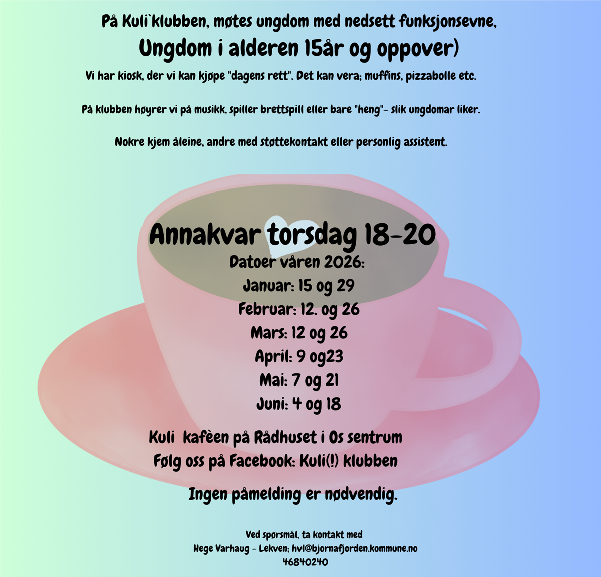 Kulí-klubbenKulí-klubben er for ungdommar med nedsatt funksjonsevne. Aldersgruppa er 15-25 år. Du kan kome aleine, med støttekontakt, personleg assistent eller nokon frå familien din. Her speler vi spel, høyrer på musikk, eller vi kan berre "henge". Kiosken er open. StadVi møtest på Kafé Kulí i Bjørnafjorden rådhus TidAnnankvar torsdag klokka 18-20, i oddetalsveker.Velkommen!Følg med i Facebook-gruppa vår! Sist endra 12.01.2026 14:45