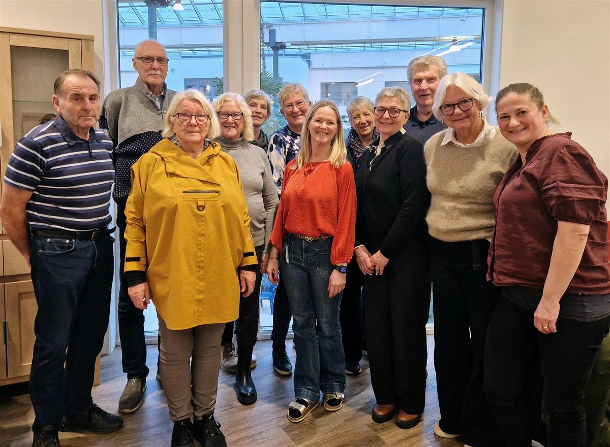 Eit utval av deltakarane i haustens samtalegruppe for pårørande ved demens. Demenskoordinator Sølvi Bjørnevoll Fagertveit i raudt i midten. Alexandra Vik frå ConnectDem ytst til høgre i biletet.