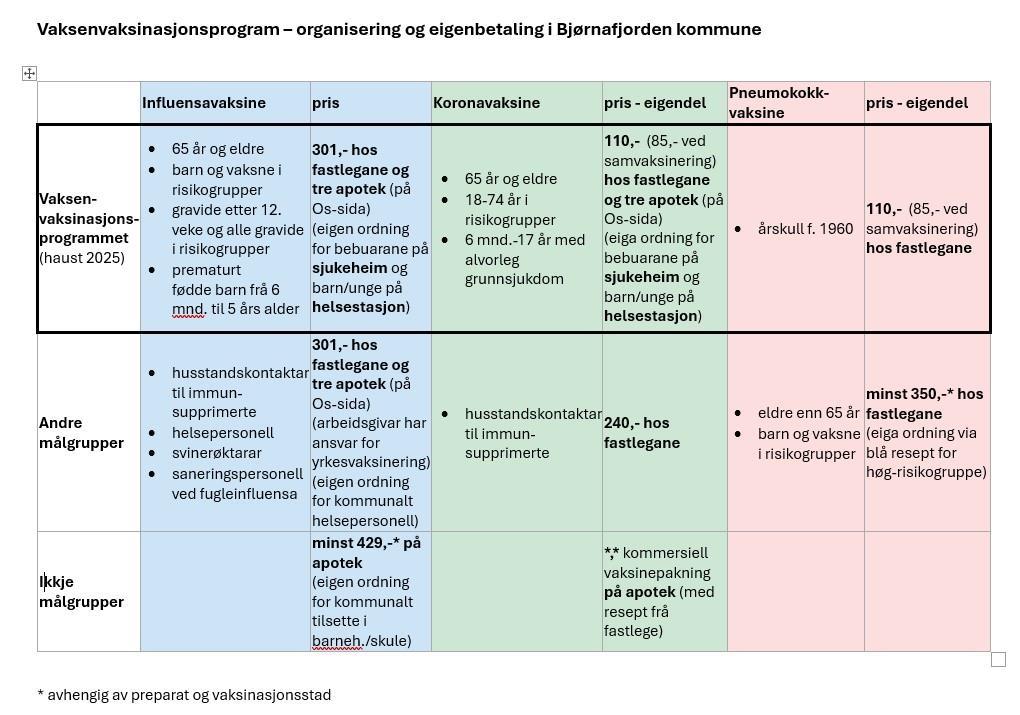 - Korona- og influensavaksine er eit tilbod i vaksenvaksinasjonsprogrammet til alle som er 65 år og eldre, i tillegg til vaksne og barn i risikogrupper.