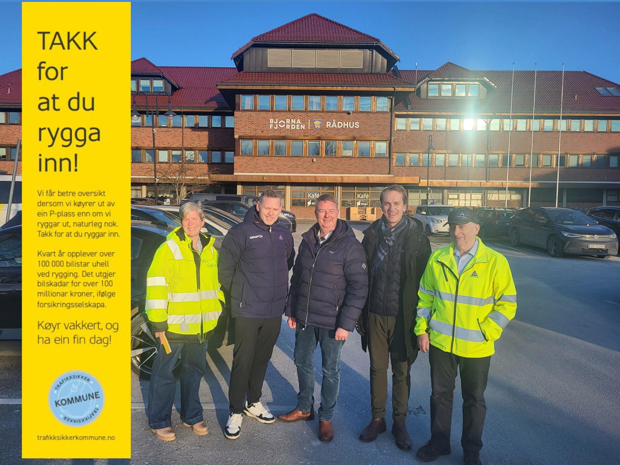 Oppfordringa om å rygge inn på parkeringsplassar gjeld både ved barnehagar, skular, butikkar og overalt elles. Før møtet hadde ordførar Terje Søviknes og Trygg Trafikk eit aldri så lite parkeringsstunt framfor Rådhuset, for å minne bilistane på at ryggar du inn, reduserer du risikoen for uhell og skade når du skal ut igjen. Enkelt, men effektivt. Denne føremiddagen viste seg at dei aller fleste hadde rygga inn. Takken var ein gul lapp på frontruta med ei helsing frå Trafikksikker kommune.