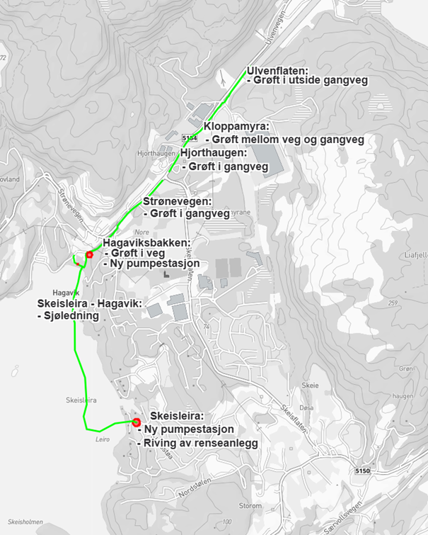 - Ny avløpsleidning skal frakte avløpsvatnet frå Hagaviksbakken, langs Strønevegen og til Ulvenflaten for påkopling til eksisterande leidning fram til OHARA.