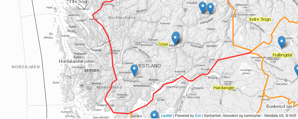 Indre delar av Bjørnafjorden ligg i snøskredsone Voss (markert med raud linje), kor det no er meldt om stor skredfare.